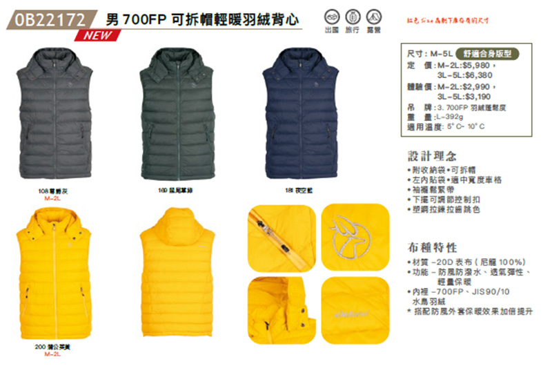 首頁 > 最新上架 > WILDLAND荒野 男700FP可拆帽輕暖羽絨背心 0B22172