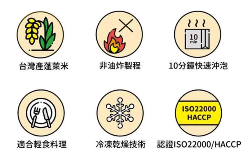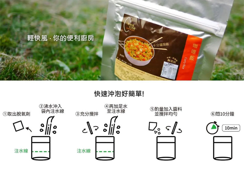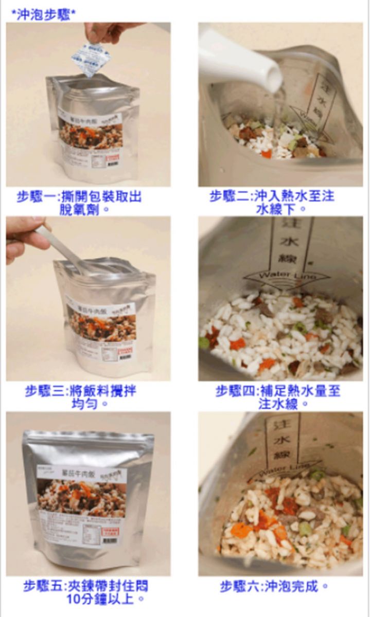 本產品採站立夾鍊袋式包裝,附控制水位之注水線標示,沸水可直接注入袋內,熱水沖泡十分鐘即可食用,保證不含防腐劑喔!